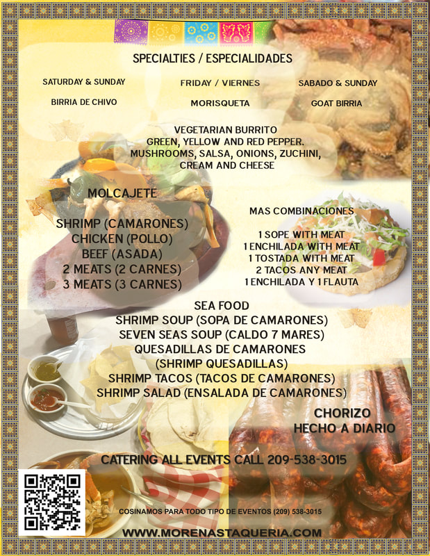 Carnitas (Pork), Carne Asada (Beef), Chile Verde (Pork), Chile Colorado (Beef), Cabeza (Head),